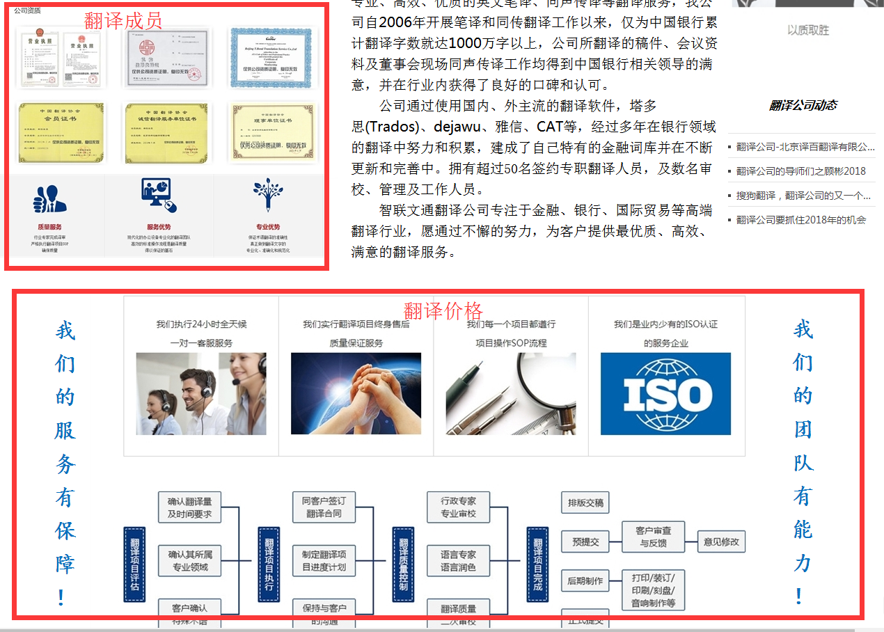 左侧绿色的导航栏目可以去除掉,首页红框标识的地方版块修改为翻译范围把你内页的翻译范围调取出来放到这个版块,一定是要文字的格式而不是图片